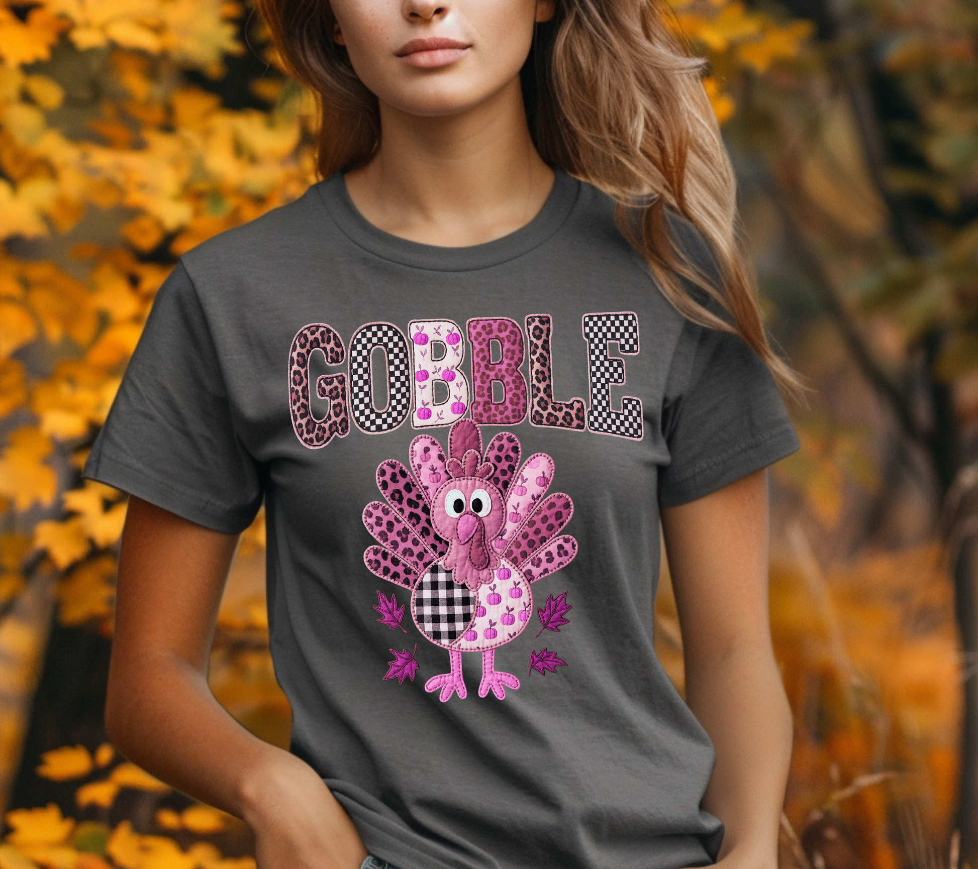 Add a pop of fun and festive pink to your fall wardrobe with our Pink Gobble Turkey T-Shirt! This playful design features a charming turkey with patchwork-style feathers in pink, leopard, plaid, and pumpkin prints, paired with bold “GOBBLE” lettering for the perfect Thanksgiving vibe.