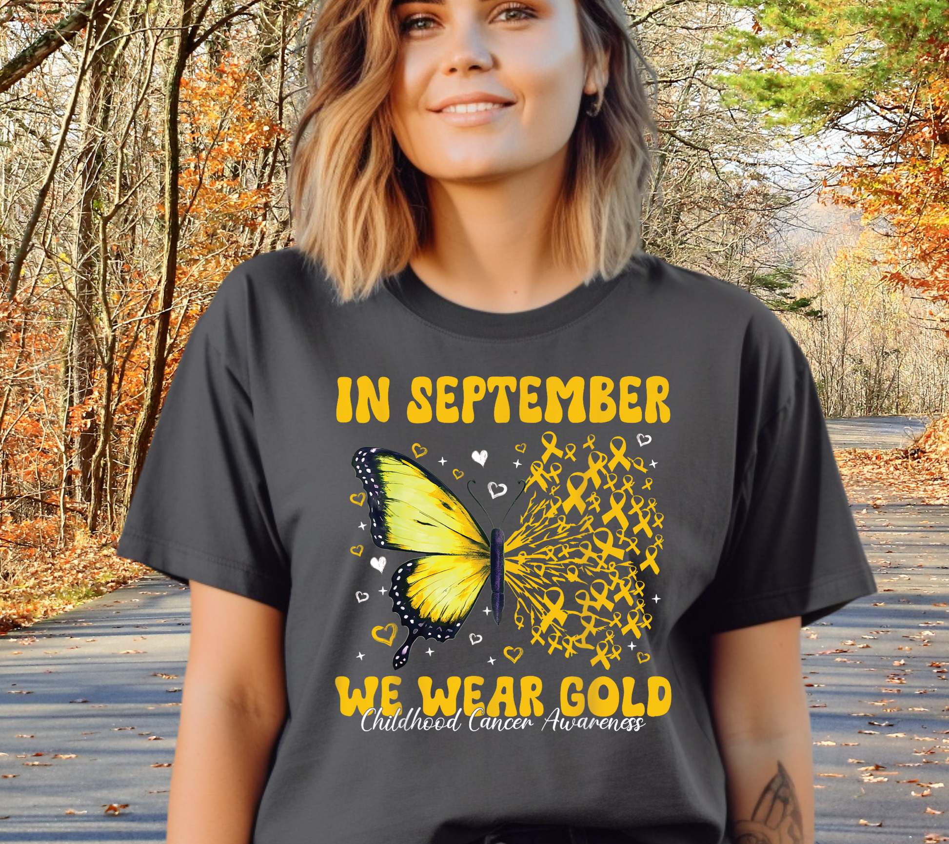 In September We Wear Gold T-Shirt | Butterfly Gold Ribbon Childhood Cancer Awareness Tee (013)