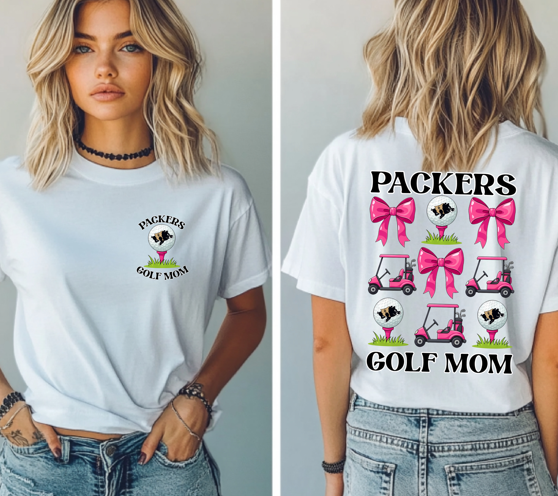 Packers Golf Mom Shirt – Pink Bow Golf Cart Graphic Tee – School Spirit Game Day Shirt – Front & Back Design