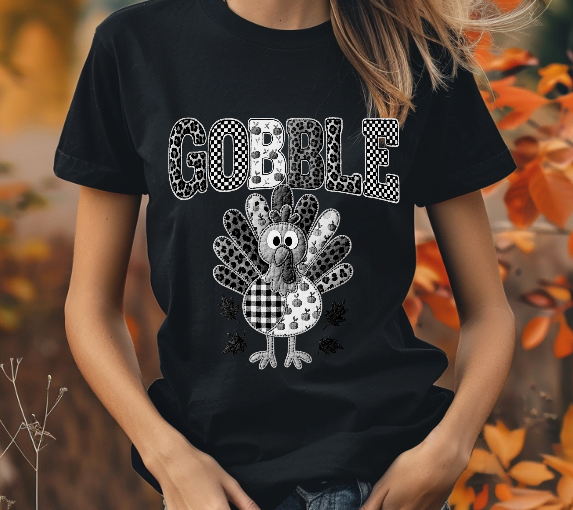 Bring farmhouse charm to your Thanksgiving outfit with our Black and White “Gobble” Turkey T-Shirt! This stylish design features a cute patchwork turkey with buffalo plaid, checkered, and pumpkin patterns in neutral tones — making it the perfect fall tee for anyone who loves rustic simplicity with a modern twist.