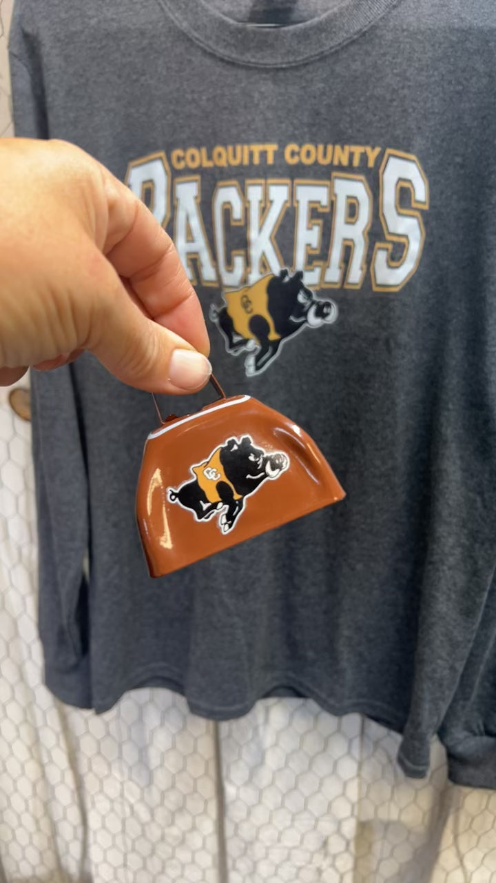 Get ready to amplify the excitement at high school games with our small cowbells! These durable and vibrant cowbells are perfect for cheering on your favorite team. Each cowbell measures approximately 3 inches in height, making it easy to carry and hold. Crafted from high-quality metal, Packer printed logo. Hawg on one side, Packers logo on the front. They produce a loud and clear sound that will energize the crowd and show your team spirit.