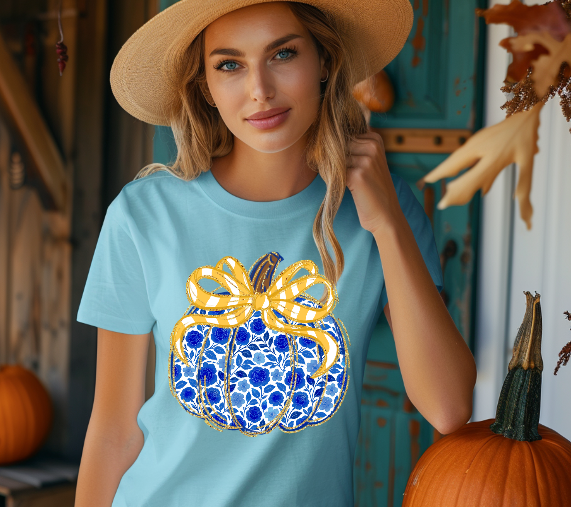 Add a touch of Southern charm and fall elegance to your wardrobe with our Blue Floral Pumpkin T-Shirt. This beautiful design features a blue and white floral pumpkin topped with a gold and yellow gingham bow, blending farmhouse chic with cozy autumn style.